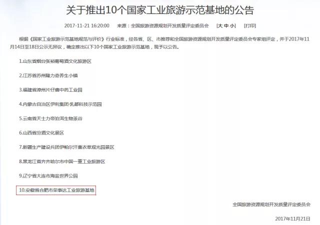 •       11月21日,全國旅游資源規劃開發質量評定委員會發布公告,公布10個國家工業旅游示范基地,安徽省合肥市榮事達工業旅游基地成為安徽省唯一入選單位。