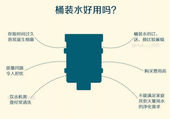 四、“桶裝水+飲水機”模式依然具有缺陷:1、不新鮮、不安全:桶裝水保鮮期一般為48小時,放置過久就成了死水,同時空氣中的細菌會在水中迅速繁殖,尤其在相對封閉的死水中繁殖速度更快,產生污染。2、不經濟:家庭用桶裝水,每年少則數百元,多則上千元,日積月累,也是相當大的一筆開銷,而水處理產品除每年更換濾膜外,水費幾乎忽略不計。